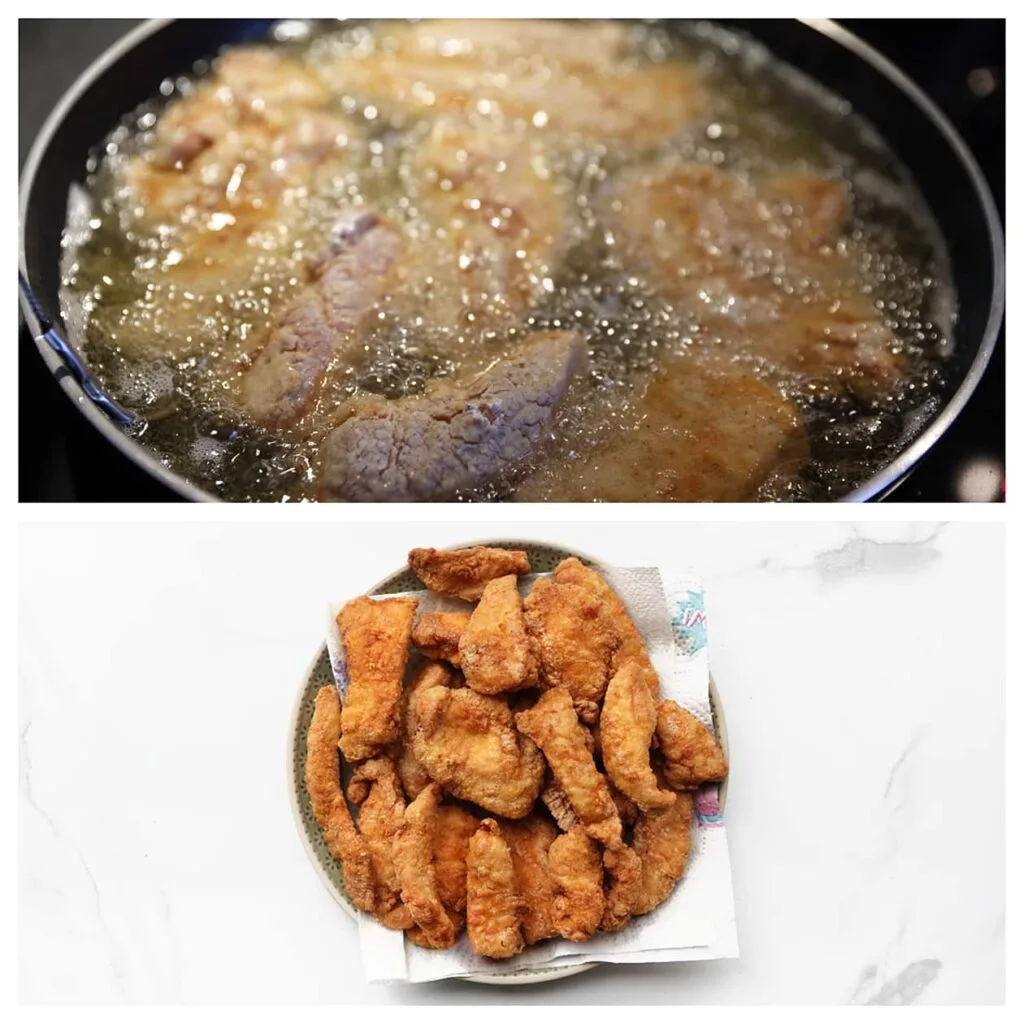 Heat a thin layer of sunflower oil in a skillet over medium heat (175 ℃, 350 °F). Fry the chicken until golden brown and drain on paper towels.
