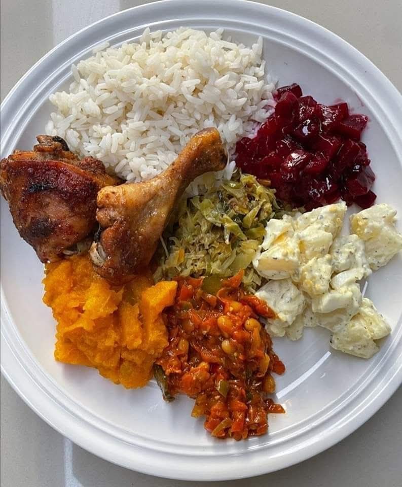 White Rice with Chicken, Cabbage Stir-Fry, Mashed Pumpkin, Beetroot Salad, Potato Salad, and Spicy Tomato Sauce